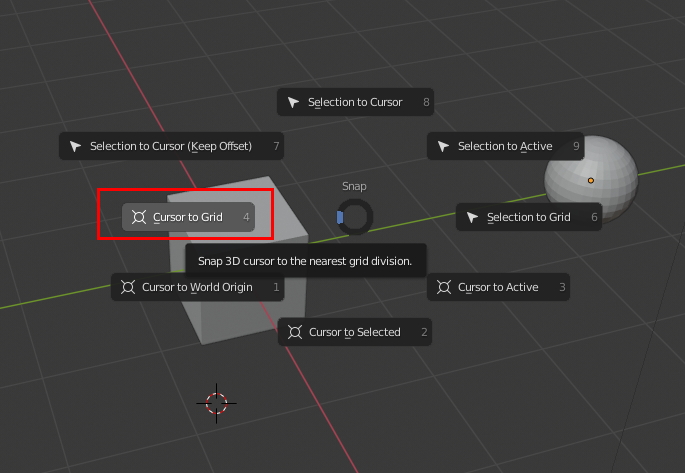 Shift + S : 3D Cursor Snap 창이 열림니다.