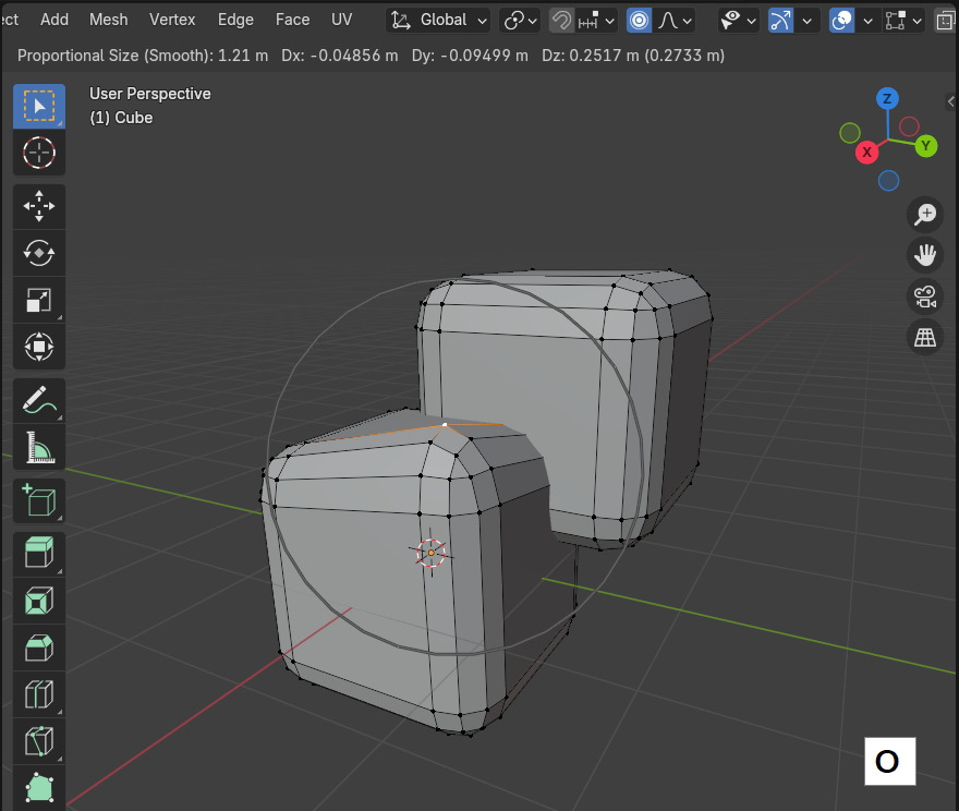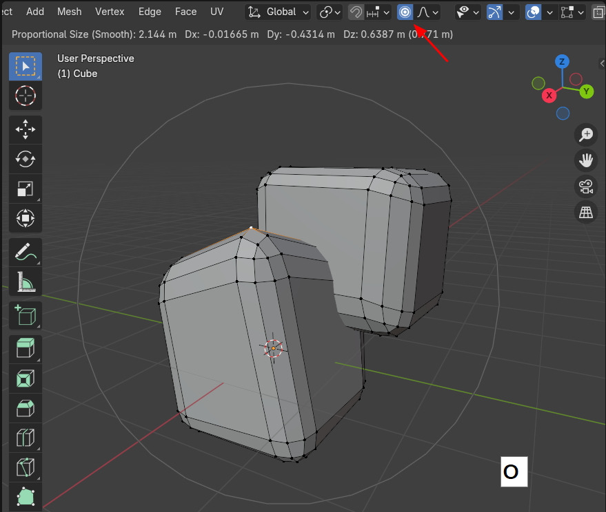 그러나 연결된 메쉬에만 영향력을 주고 싶을 때에는 Proportional Editing을 실행할 때, Alt + O 로 실행하면, 아이콘의 모양이 바뀌고, 연결되지 않은 요소들은 영향을 받지 않습니다.