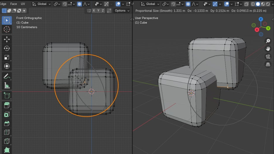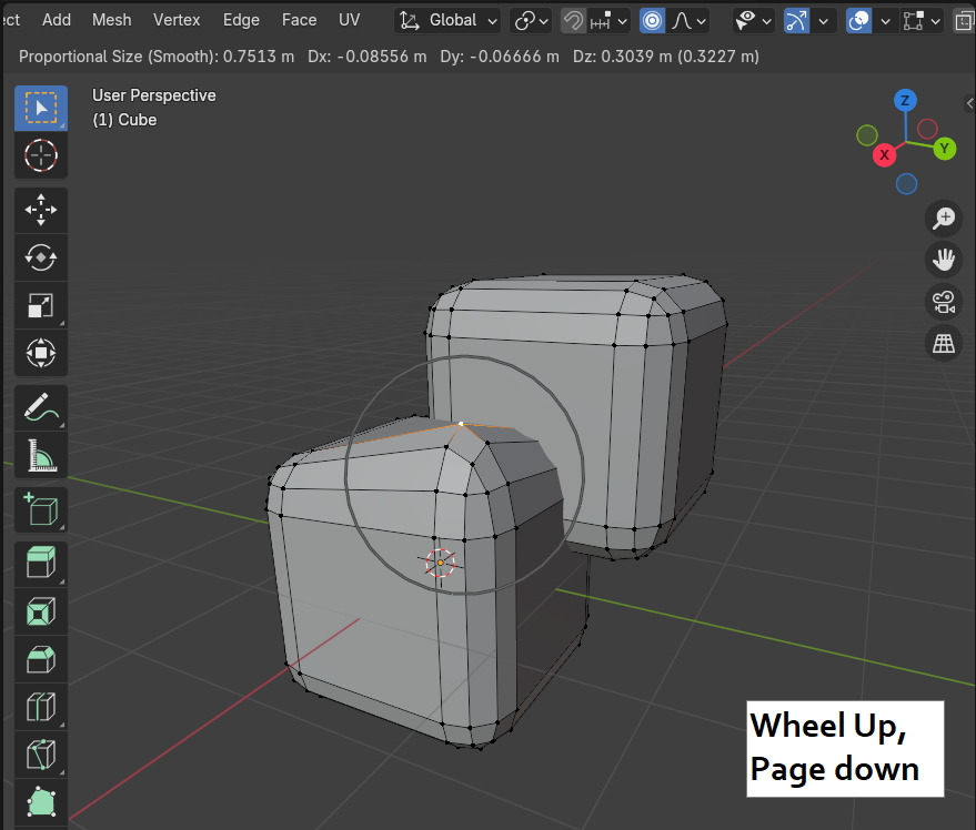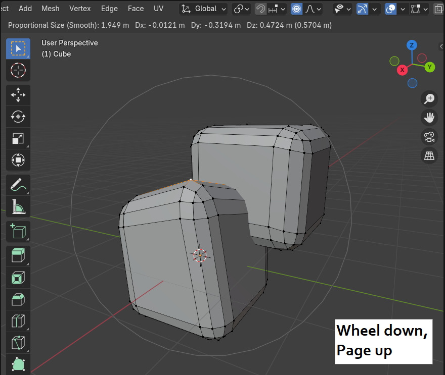 이번에는 Proportional Editing을 활성화(단축키 O) 시키고, G키로 움직여 봅니다.