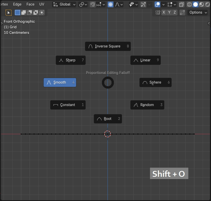 Transform 작업(현재 G키) 중일 경우에 Shift + O 를 클릭하면, Falloff 곡선이 차례대로 변경됩니다.