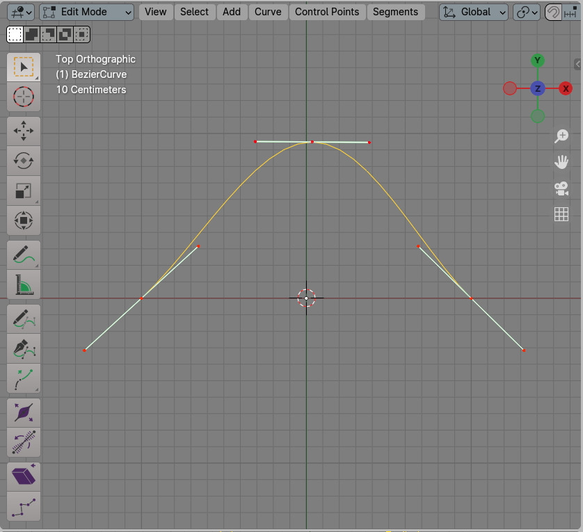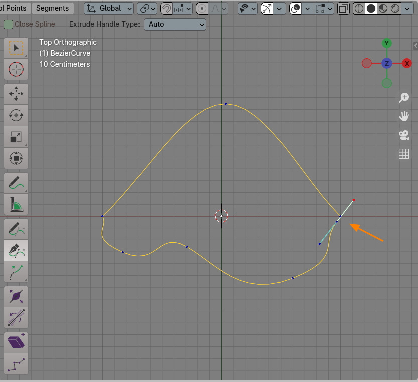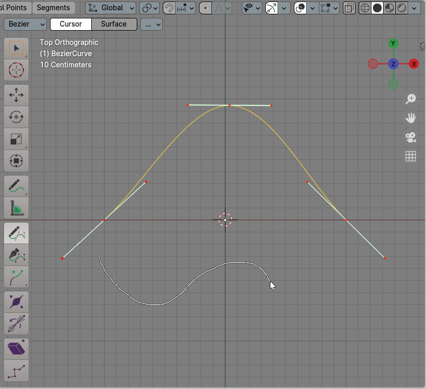 Curve의 Vertex, Control Points들이 보이고, 각각의 Handle이 보입니다. Handle에서 좌우 끝점 하나를 선택해서 G키(이동)으로 하거나 Handle의 중앙점, Vertex를 선택해서 R키(회전)으로 하거나, 또는 S키(크기)로 조절해서 커브의 모양을 변형할 수 있습니다.