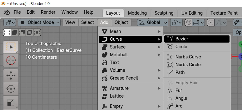 Curve는 Object mode에서 Add / Curve 에서 생성할 수 있습니다. 대표적인 Curve Type, Bezier 를 선택합니다.