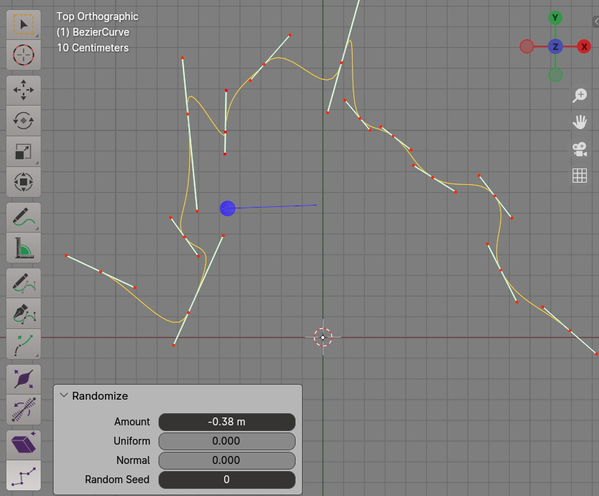 그 아래의 Randomize 메뉴를 하려면 Curve에 버텍스들이 좀 필요하므로 Subdivision 명령으로 Curve를 세밀하게 나누었습니다. 버텍스들이 다 선택되었습니다. 그리고 Randomize를 실행합니다.
