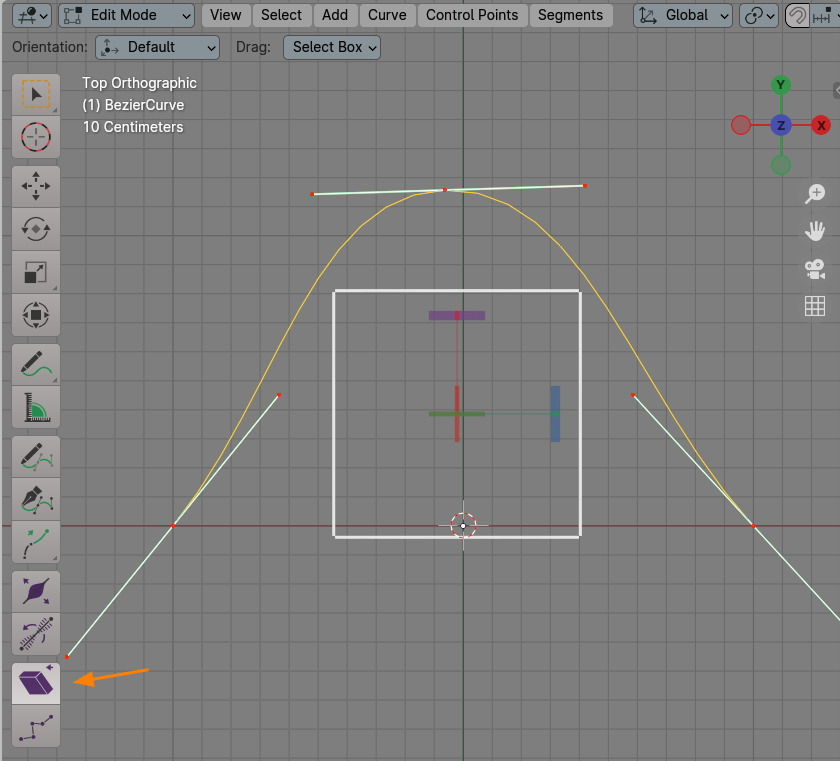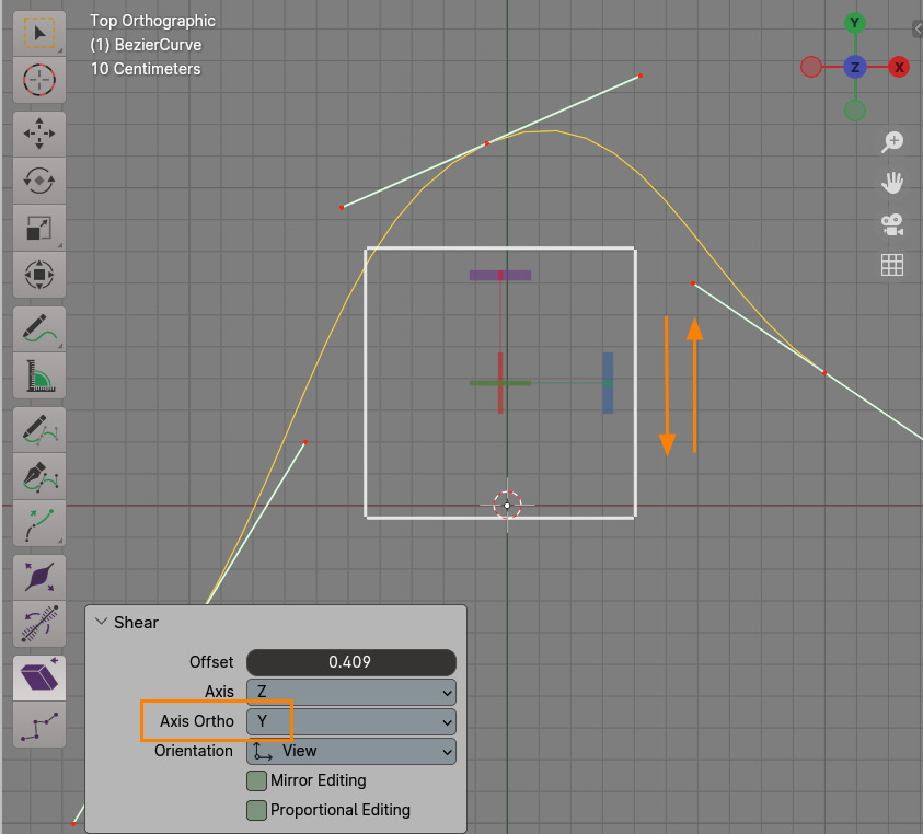 Shear는 선택한 버텍스들을 기울어지게 합니다. 기즈모는 사각형 모양을 하고 있습니다.