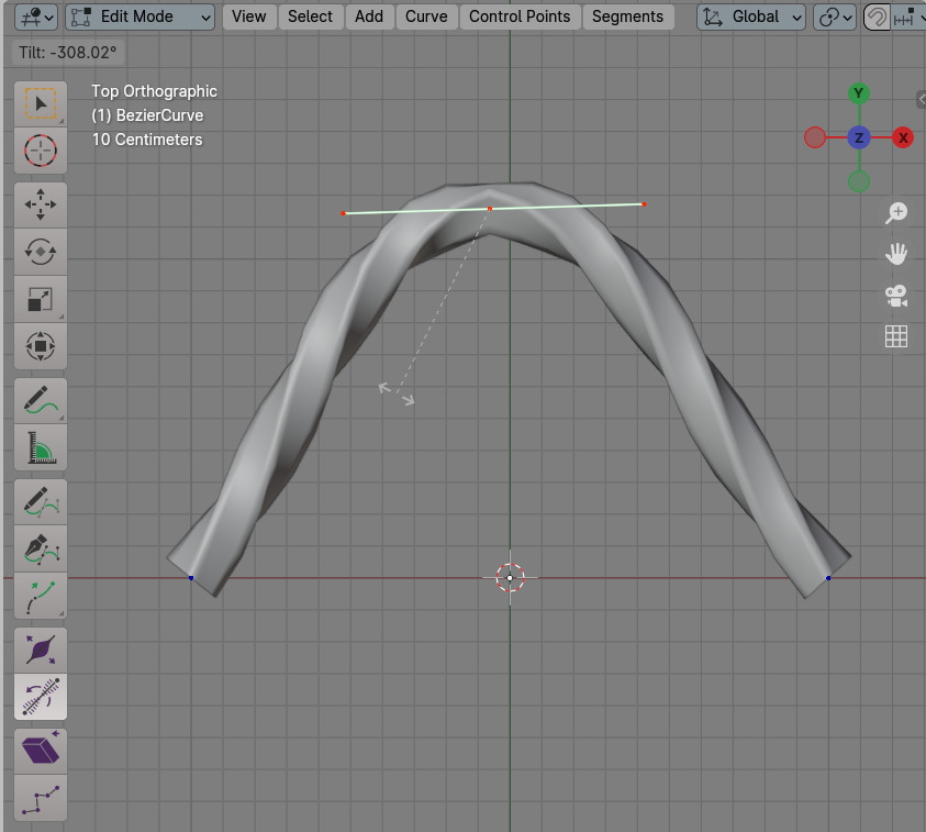 Curve 를 선택하고 Edit mode에서 Toolbar의 하단을 보면, Radius와 Tilt가 있습니다.