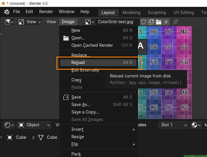 이 Reload 명령은 Image Editor에서 Image / Reload 라는 곳에 실행명령이 있습니다.