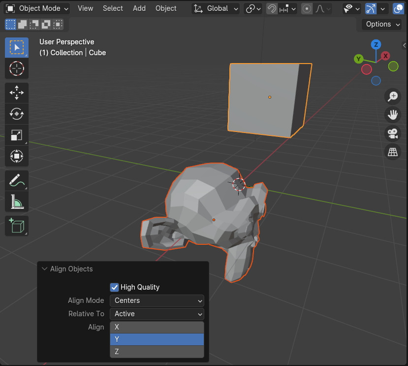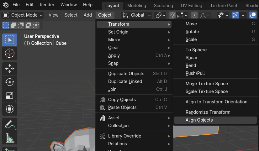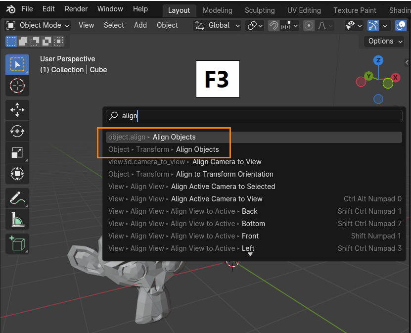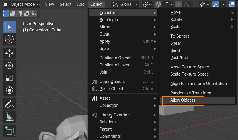 Align 명령의 위치는 Object mode에서 Object / Transform / Align Objects 에 있습니다.