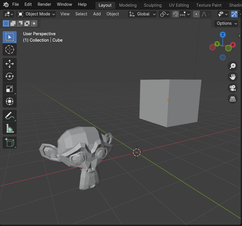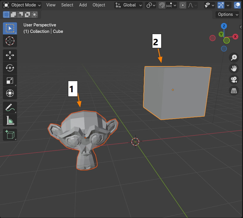 오브젝트를 선택합니다. 이때 선택하는 순서가 중요합니다. 블렌더에서는 항상 마지막으로 선택하는 오브젝트의 선택외곽선의 색은 연한 오렌지 색으로 나타냅니다. 연한 색은 Active된 상태입니다.