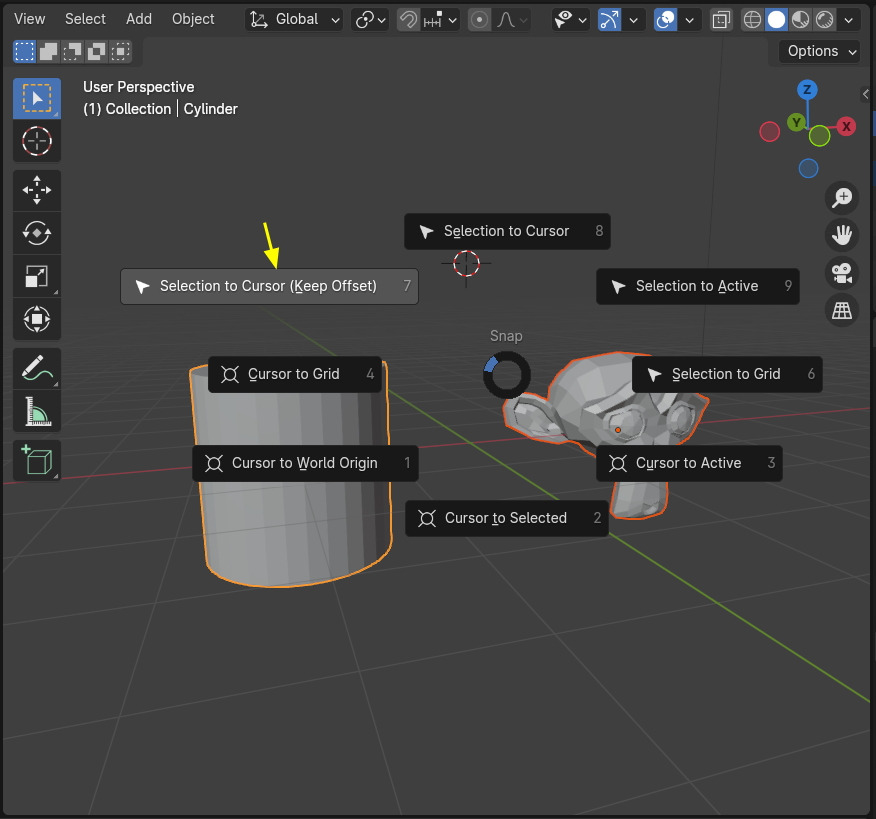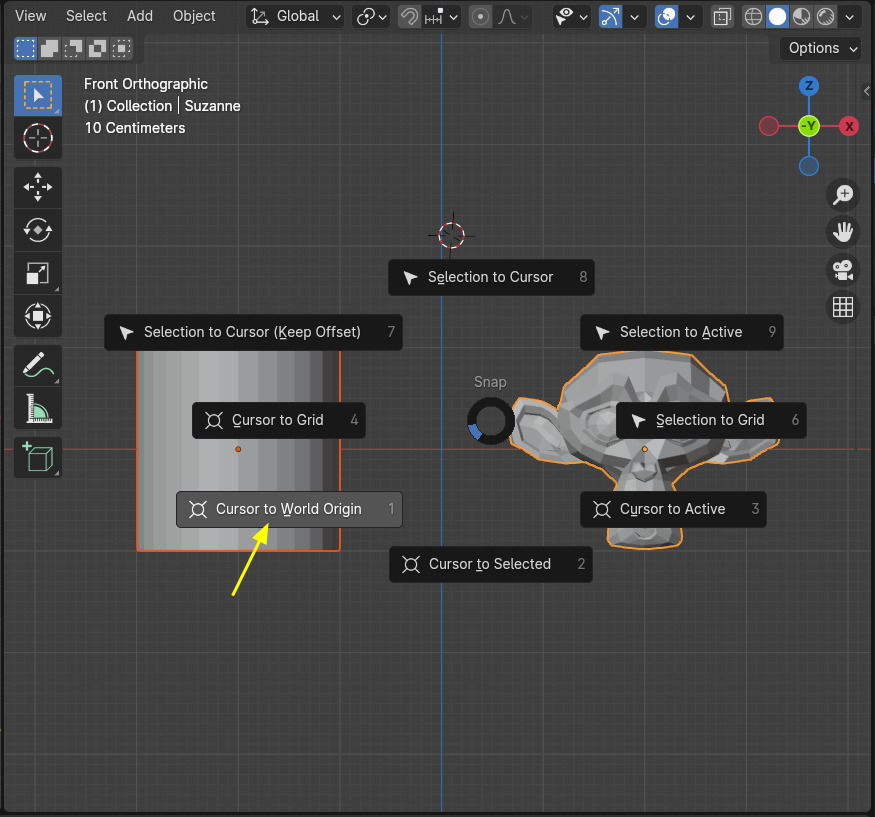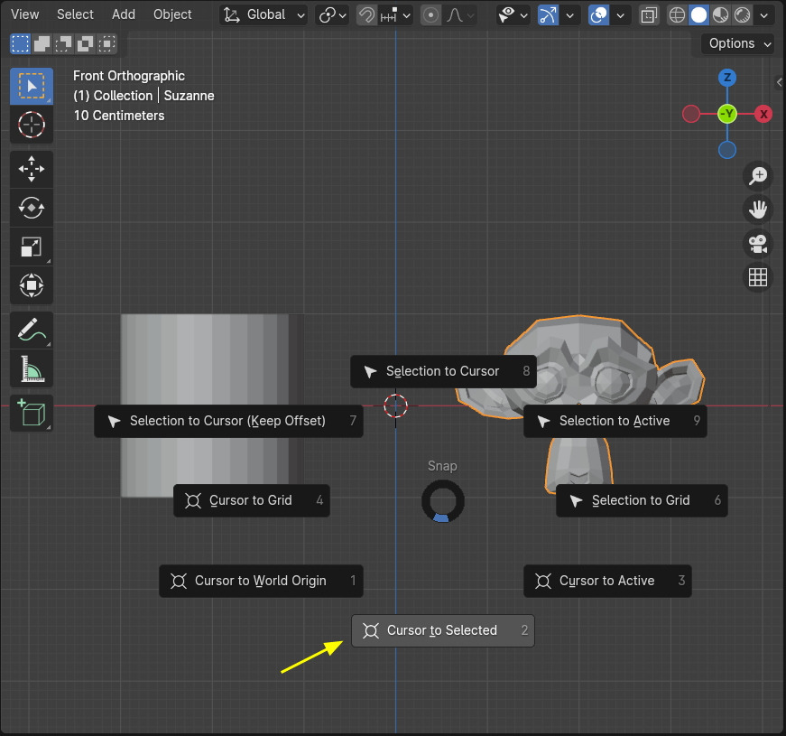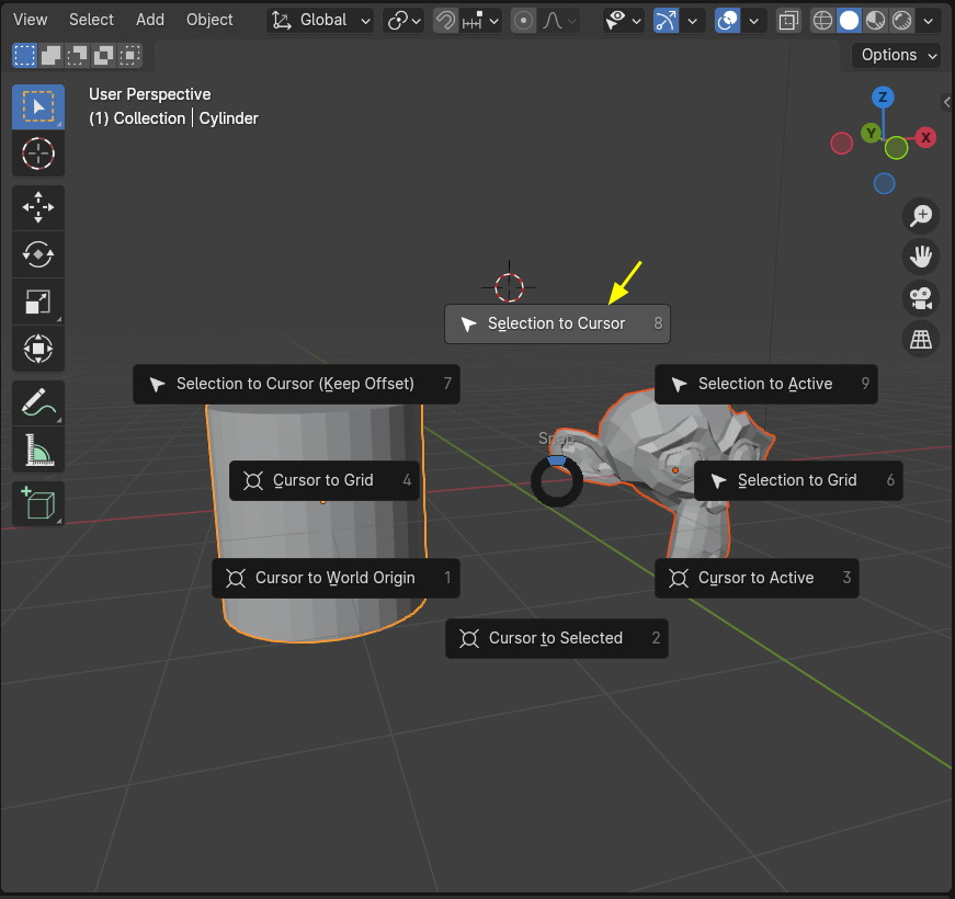 세번째는 Cursor to, 즉 옮기는 대상이 3D 커서,