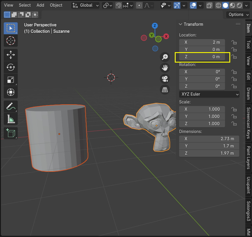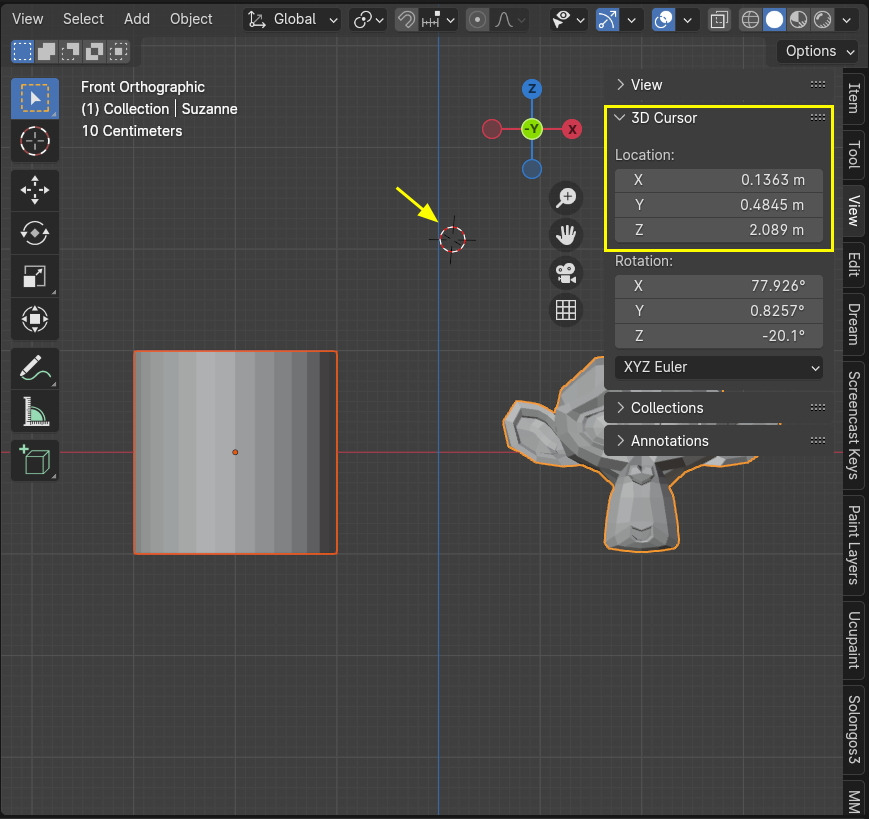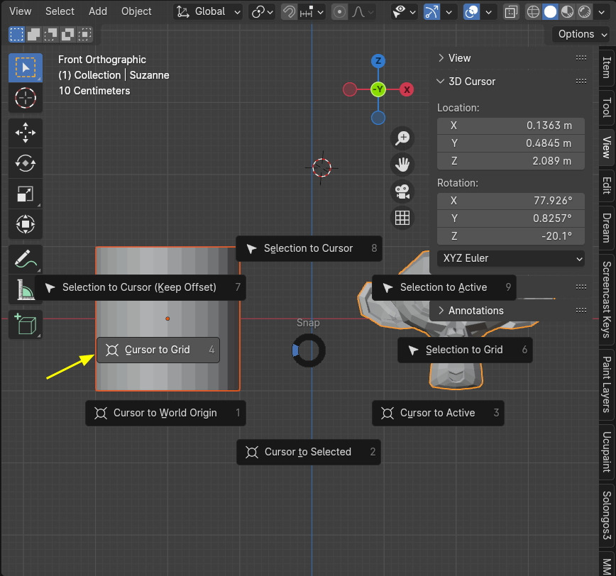 이번에는 3D Cursor를 Grid로 정렬합니다. 커서의 Loction 값이 소수점입니다. (View 탭에서 3D Cursor의 위치를 볼수 있습니다.)