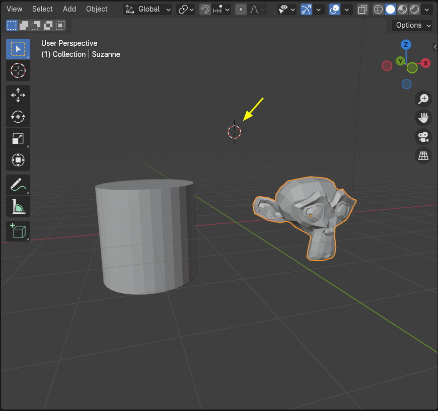 현재, 3D 커서의 위치를 임의의 위치로 옮겼습니다. 옮기는 방법은 Shift + RMB