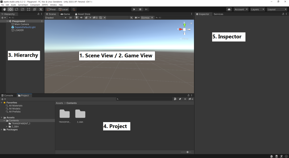 유니티의 핵심 인터페이스, 5개의 패널 Pannel로 아래와 같습니다.
