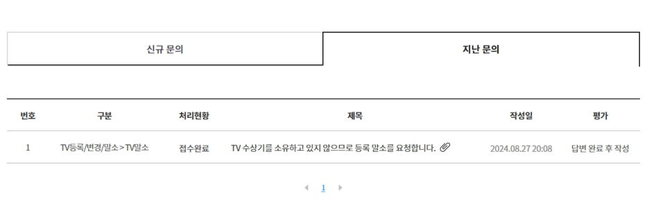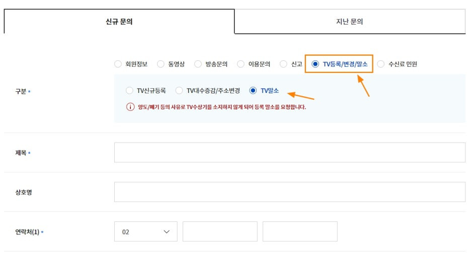 7. 1:1 메일 문의 신청서 양식을 보시면, TV등록/변경/말소에서 TV말소를 선택합니다.