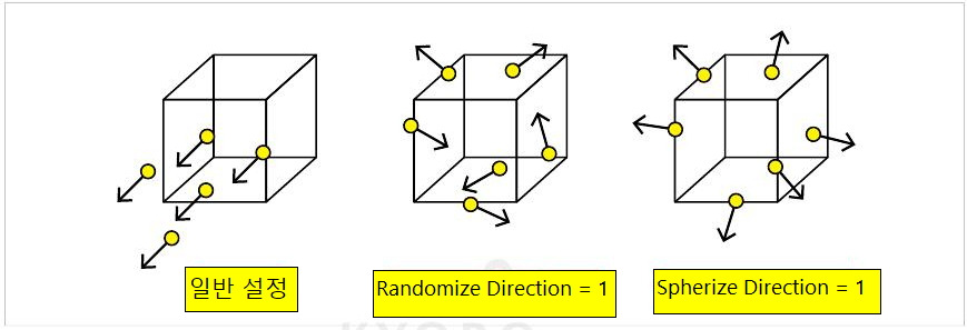 Randomize Direction 과 Spherize Direction 를 사용하면, 파티클 발생시 진행 방향에 변화를 줄 수 있습니다.