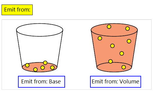 파티클의 생성위치. Base로 설정하면 Cone의 밑바닥 원에서만 생성되고,