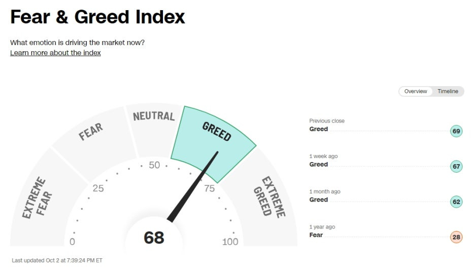 10월 2일 미국 증시 공포 탐욕 지수 (Greed and Fear Index)