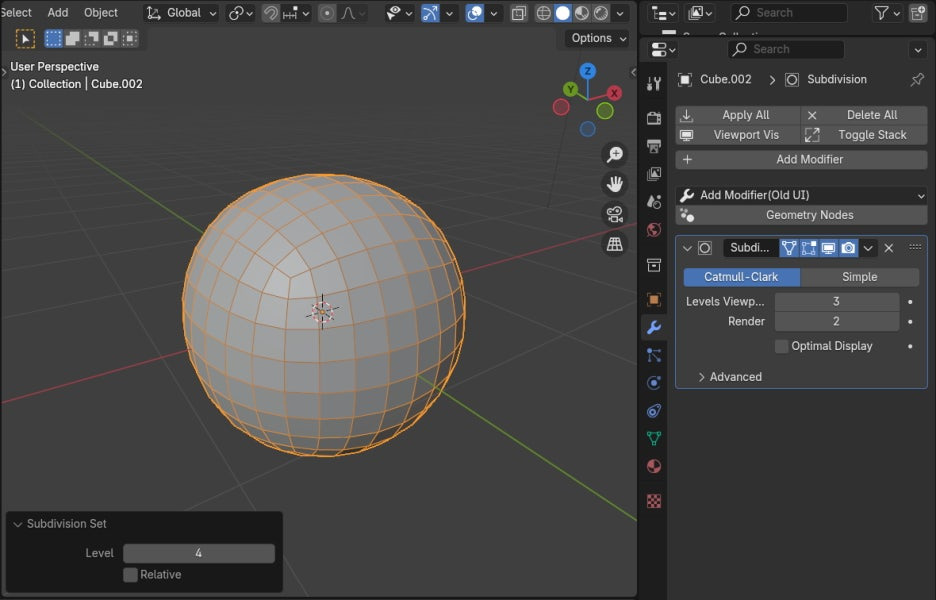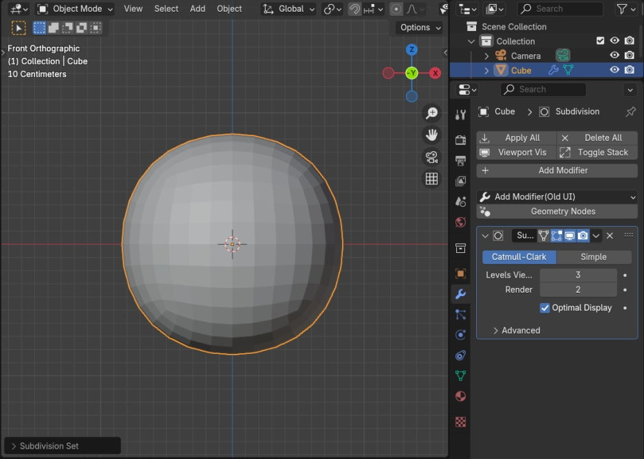 Cube에 Subdivision Surface Modifier를 적용합니다.