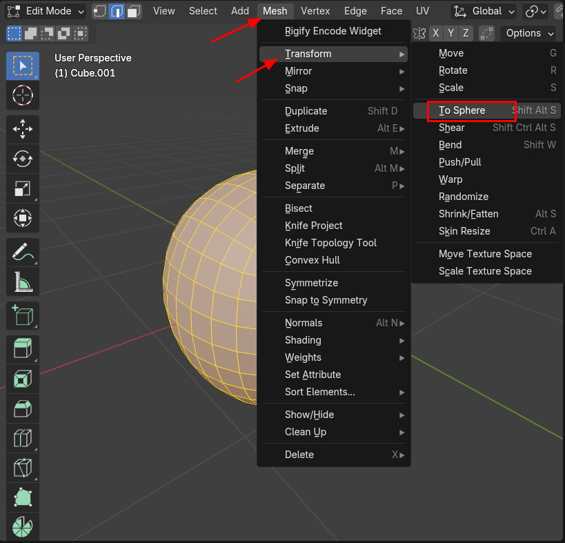 Mesh / Transform / To Sphere를 해줍니다. 단축키 Shift + Alt + S 를 하고 마우스 드래그를 해줍니다.