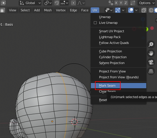 UV 메뉴에서 Mark Seam 을 클릭합니다.