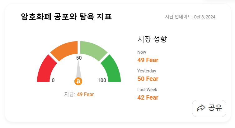 10월9일 암호화폐 공포 탐욕 지수 (Greed and Fear Index)
