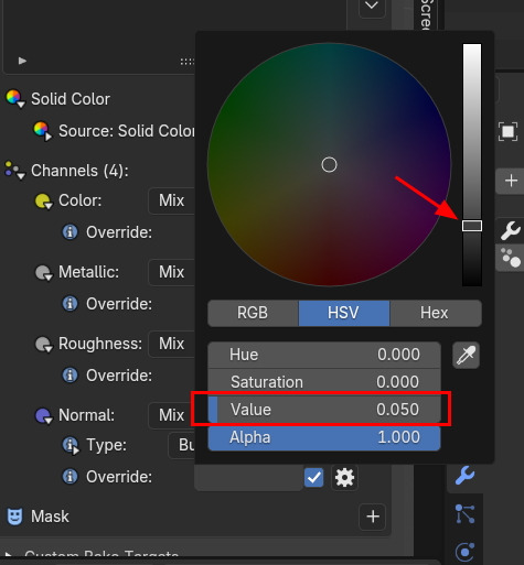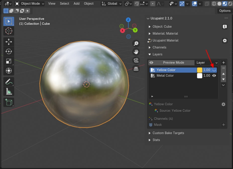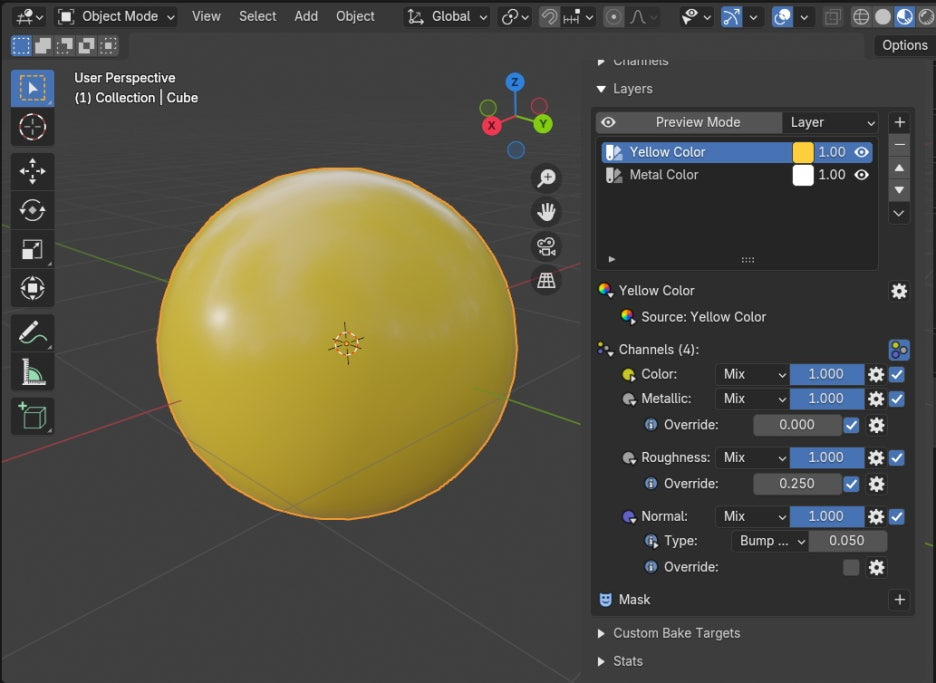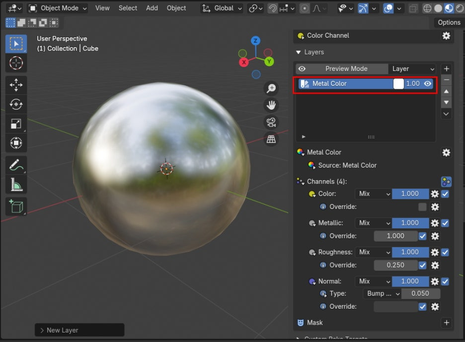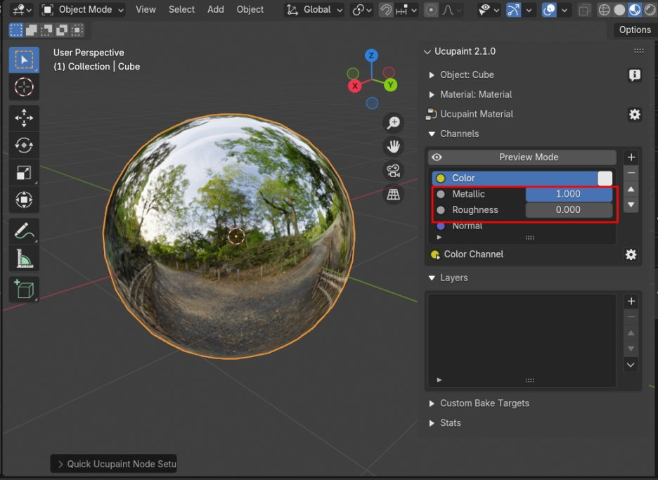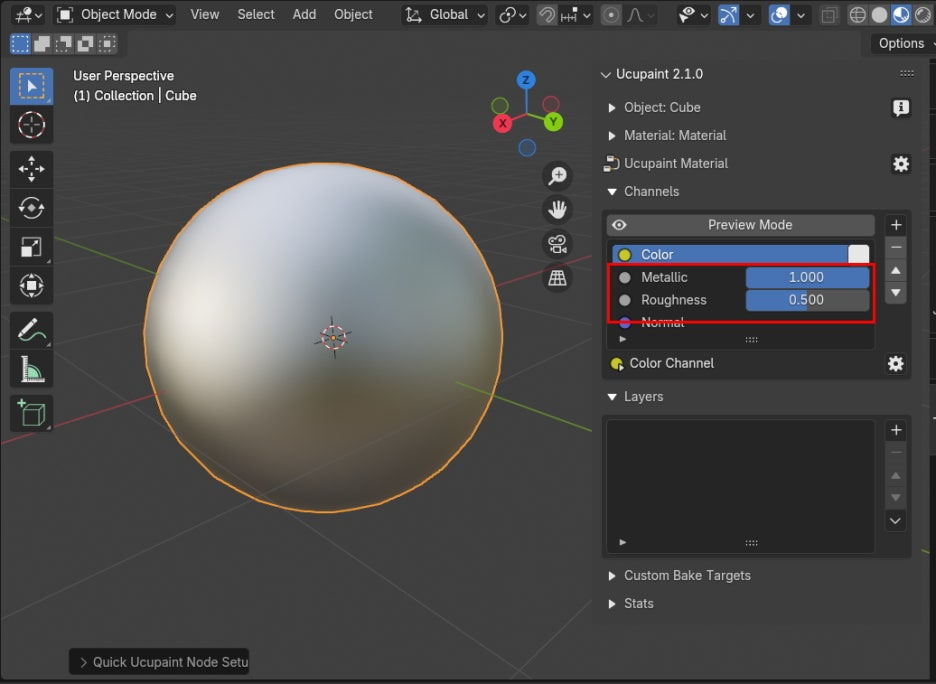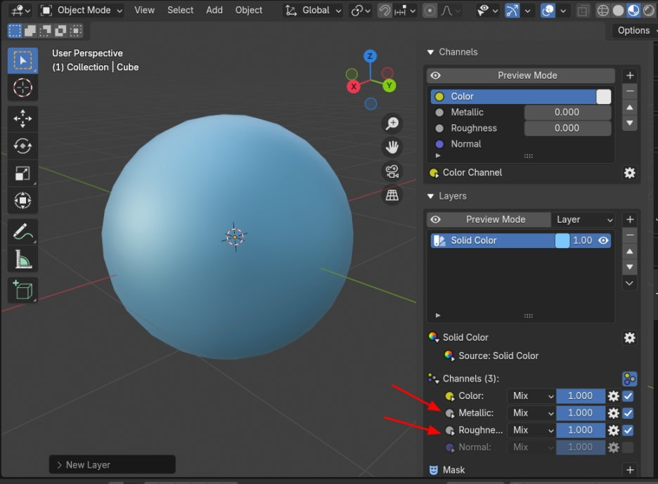 아래, Channels 에, 기본은 Color만 켜져 있었는데, Metalic 과 Roughness 를 다 켜줍니다.