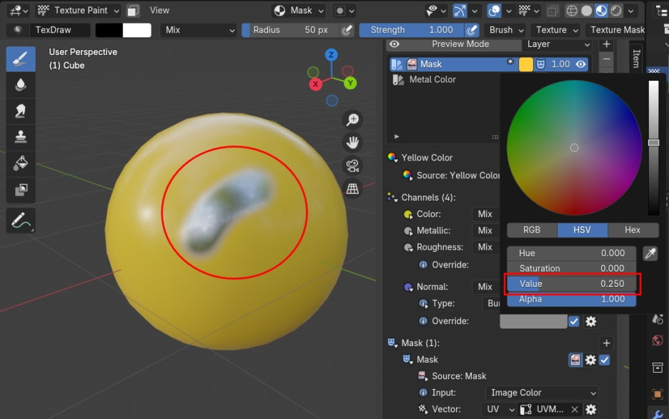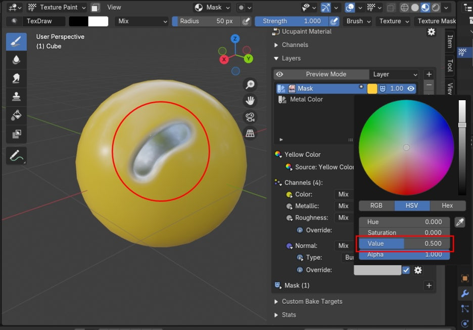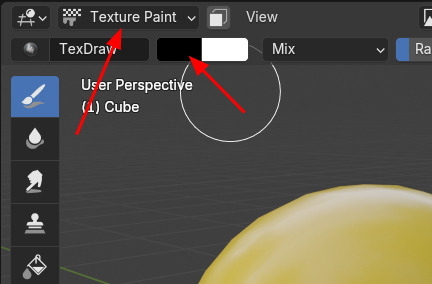 작업 모드를 Texture Paint로 전환하고, 컬러를 Black을 선택합니다.