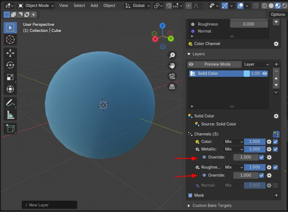 비어 있는 Override도 활성화 해줍니다. Metalic과 Roughness 를 활성화 하면 숫자 1이 등장합니다.