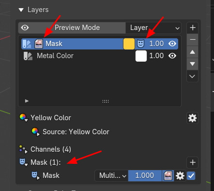 그러면, Layer에 Mask 이미지 아이콘이 등장하고, 이름이 'Mask', 그리고, 그 옆, 컬러 옆에 마스크 아이콘이 표시됩니다. 그리고 아래에 Mask 에 (1) 표시가 되어있고, Mask 이름이 표시되어 있습니다.