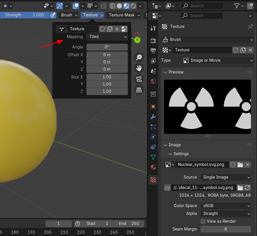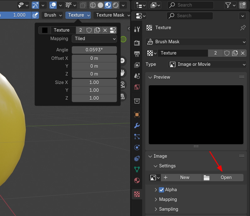 Properties , Texture 에 Brush Mask 에, Image / Settings 에서 Open으로 이미지 소스를 부를수 있습니다.