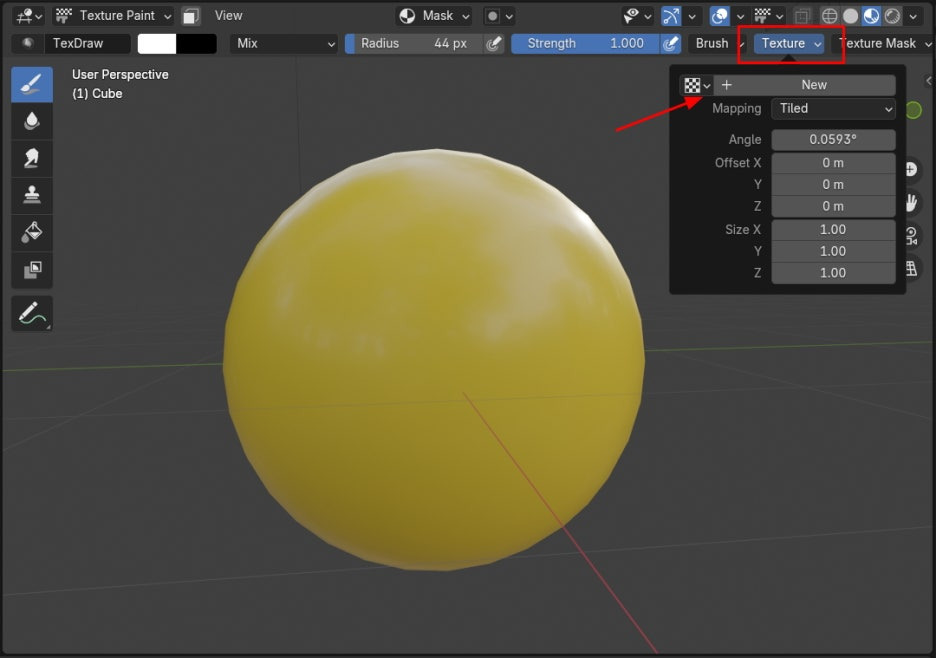 Texture Paint 작업 모드로 전환하고, Stencil 세팅을 합니다. 상단 메뉴, Texture 를 클릭합니다. 그리고, New 를 클릭합니다.