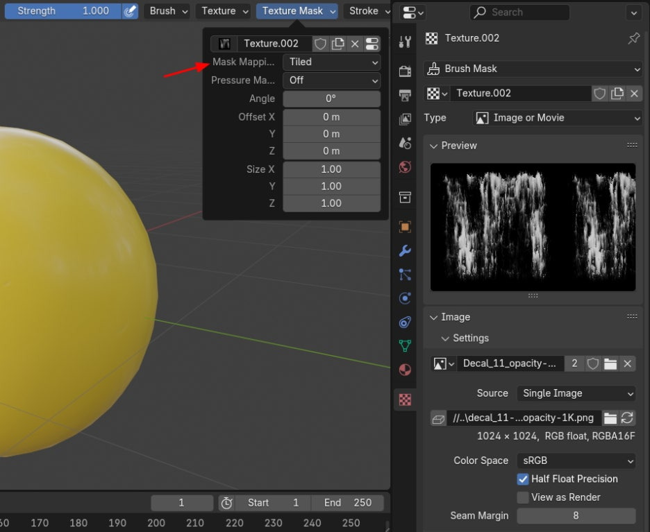 불러오면, Texture Properties 에서 파일이 불러지고, Texture Mask에서, Mask Mapping 을 'Tiled' 에서 'Stencil'을 선택합니다.