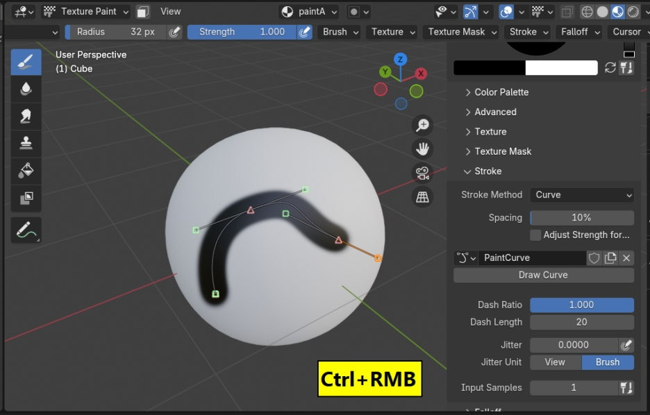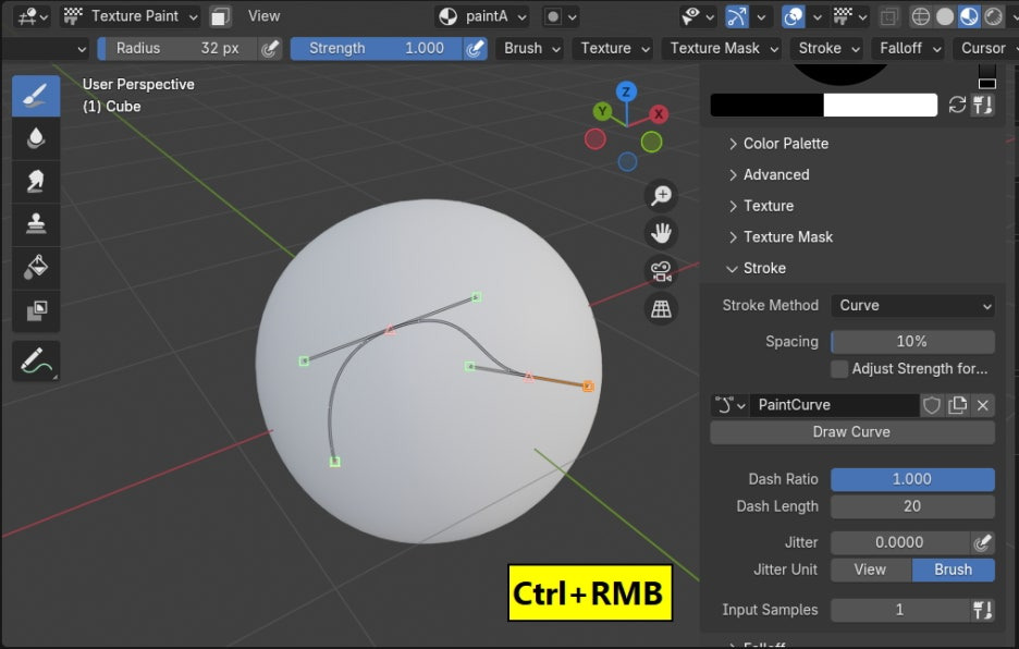 Curve를 선택하면, 좌클릭으로 커브가 나오지 않고, Ctrl 키를 누르고, 마우스 우클릭을 하면서 그리면 커브가 등장합니다.
