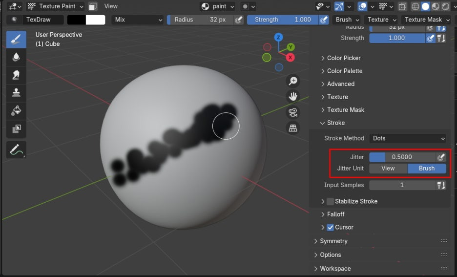 Dots의 Jitter 를 조절하여 Airbrush비슷하게 흩뿌리게 해줍니다. Jitter Unit가 View인 경우 픽셀을 기준으로 조절하고,