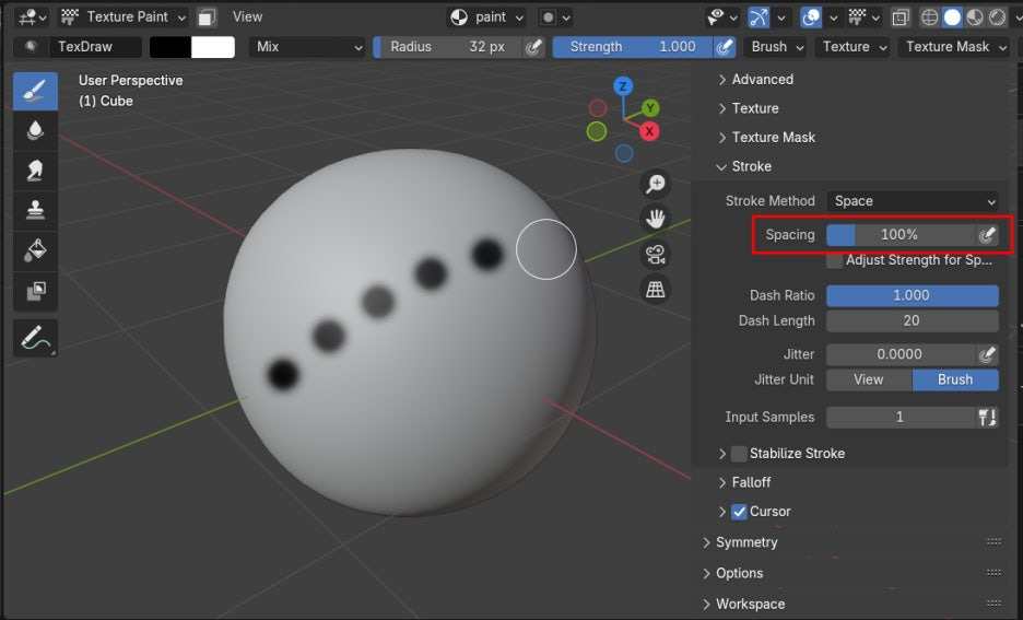 Spaceing 값을 올려주면, Brush를 구성하는 Dot 각각의 간격을 조절합니다. 100% 으로 하면 Dot 하나가 들어갈 정도의 간격으로 벌어집니다.