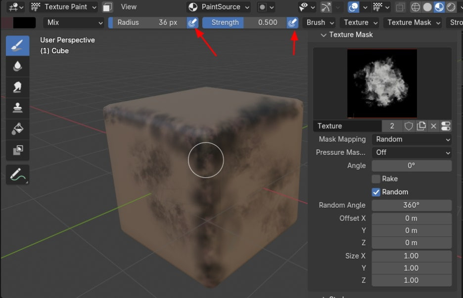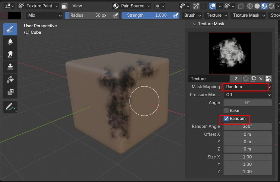 Mask Mapping을 Random으로 하고, 아래에 Random 을 활성화 해줍니다. 그러면, Draw툴이 지나가는 영역에 무작위 비슷하게 칠해집니다.