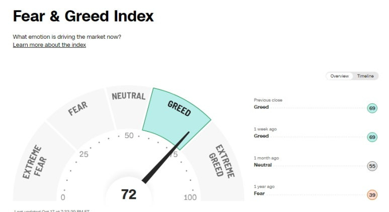 미국 증시 공포 탐욕 지수 (Greed and Fear Index): 72