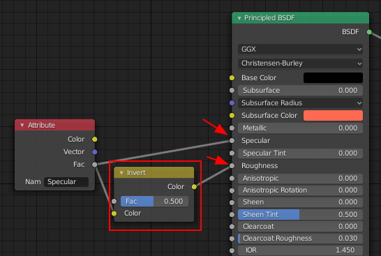 Specular 값은 높으면 높을 수록 점점 강도가 높아지지만, 반대로 Roughness는 값이 낮아야 반짝임의 강도가 쎄집니다. 그래서 중간에 Invert를 추가.