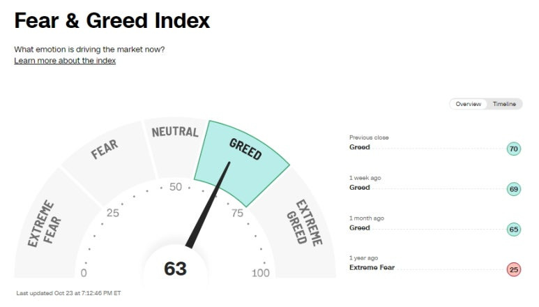 미국 증시 공포 탐욕 지수 (Greed and Fear Index): 63