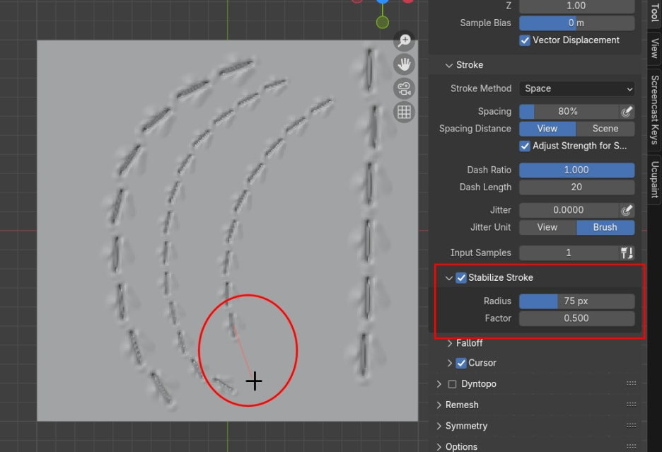 곡선을 그릴때, 브러시를 꽉잡아주는, Zbrush에서 Lazy Smooth 같은 옵션이 Stabilize Stroke를 활성화 해줍니다. (Factor는 0.5 정도)
