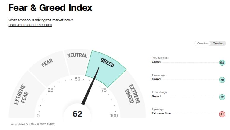 미국 증시 공포 탐욕 지수 (Greed and Fear Index): 62