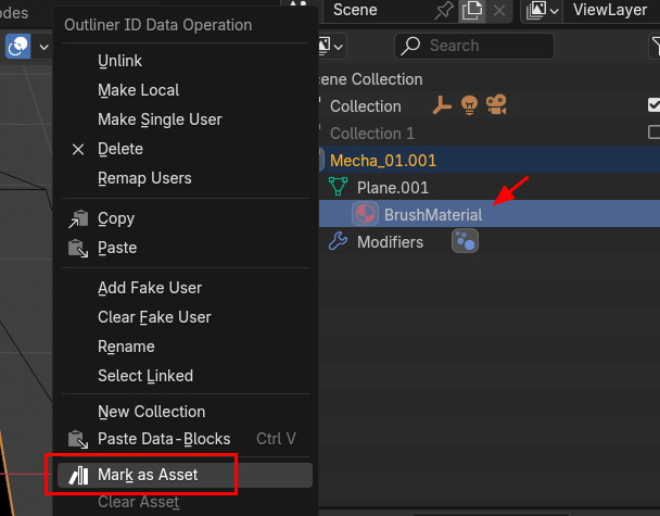 그 Material을 선택하고 우클릭을 하고, Mark as Asset을 선택합니다.