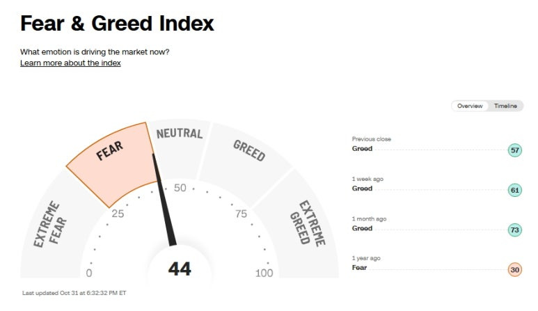 미국 증시 공포 탐욕 지수 (Greed and Fear Index): 44