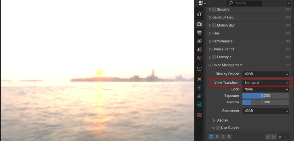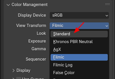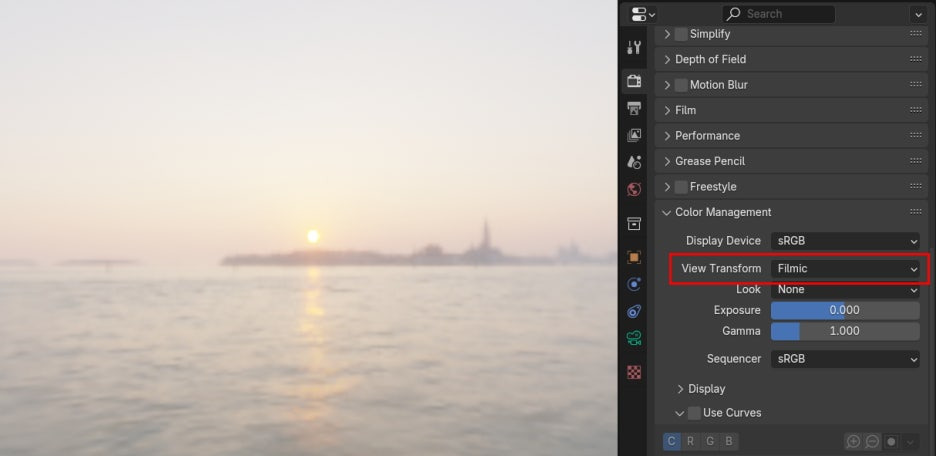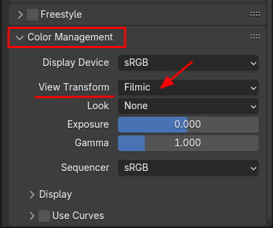 제일 아래의 Color Management 에 View Transform을 선택하면, 현재 상태는 Flimic상태입니다.
