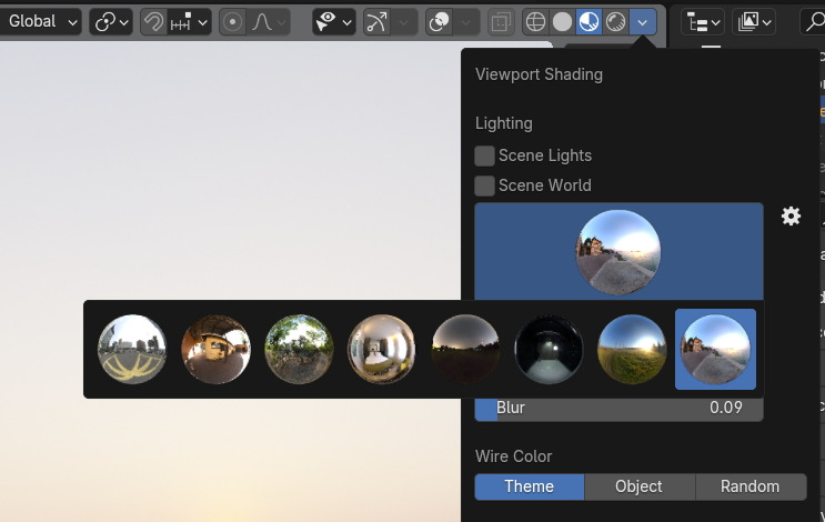 그것은 영상에서의 한계 때문인데, 그것을 확인해 보기 위해서는 Viewport Shading에서 배경들 중에 해(Sun)이 보이는 것으로 선택합니다.