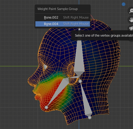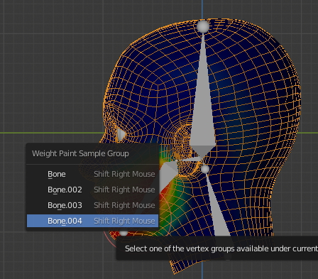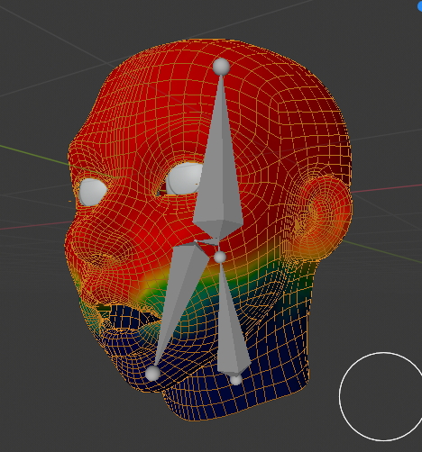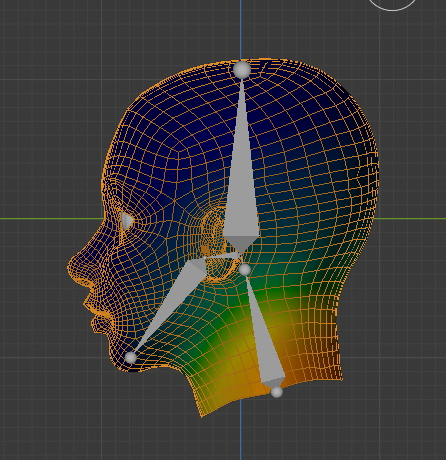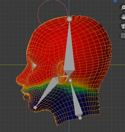 Bone 002를 선택하니 머리 상단의 영향권을 볼수 있습니다.