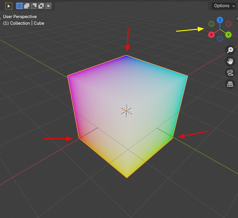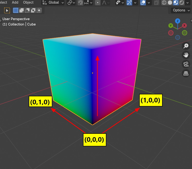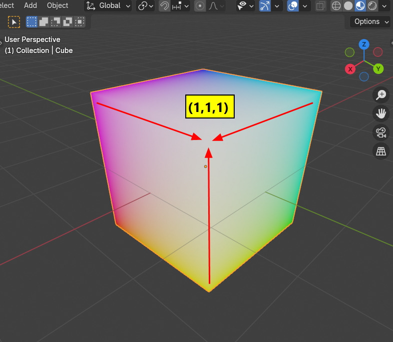 대각으로 반대 쪽 플러스 지역은 X,Y,Z의 1,1,1 값으로 White가 됩니다.