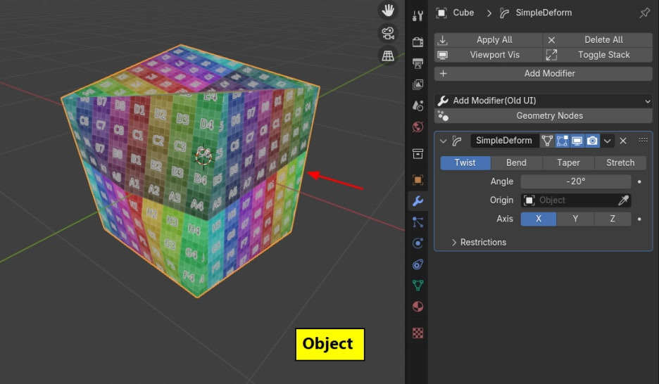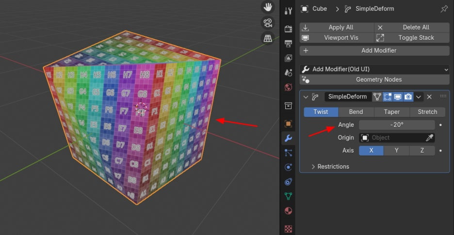Deformer / Twist / Angle값을 조절하면, 오브젝트의 변형에 좌표가 따라 갑니다.
