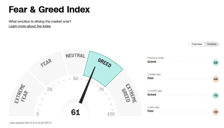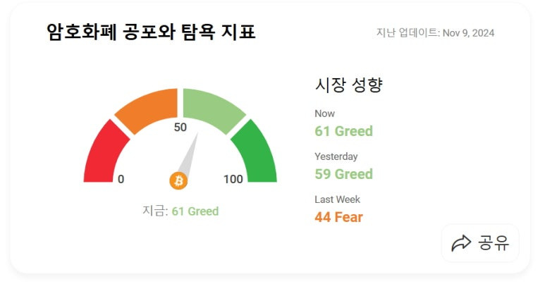 미국 증시 공포 탐욕 지수 (Greed and Fear Index) : 61
