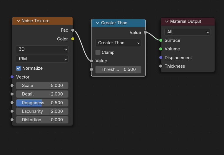 노이즈 패턴을 또렷하게 보이기 위해서, math 노드(Greater Than)를 사이에 넣습니다.