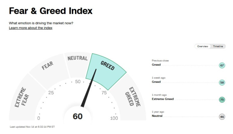 미국 증시 공포 탐욕 지수 (Greed and Fear Index): 60
